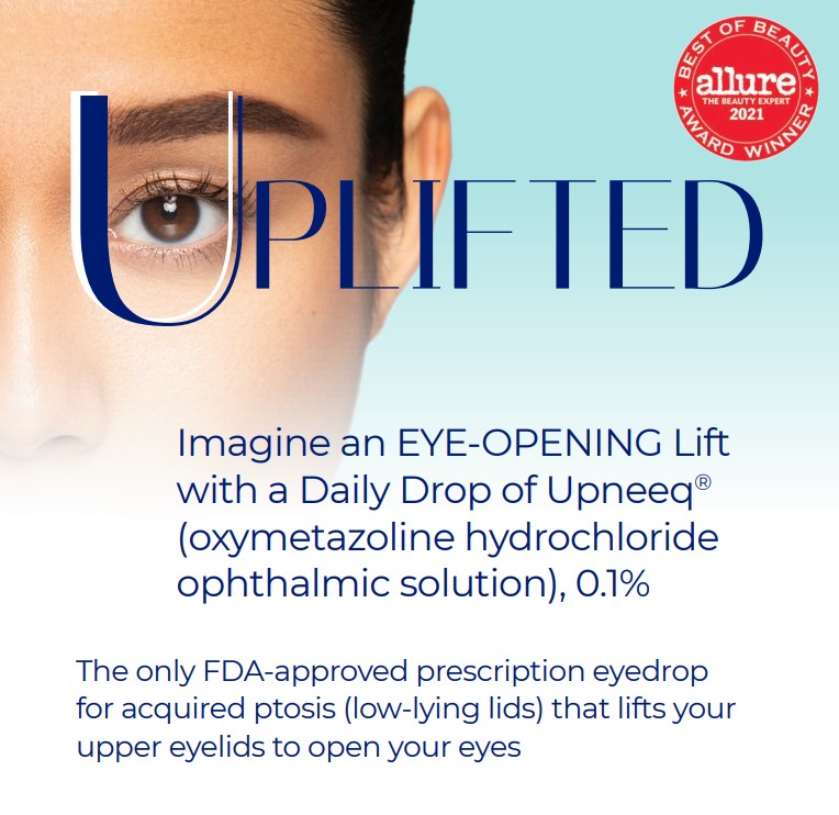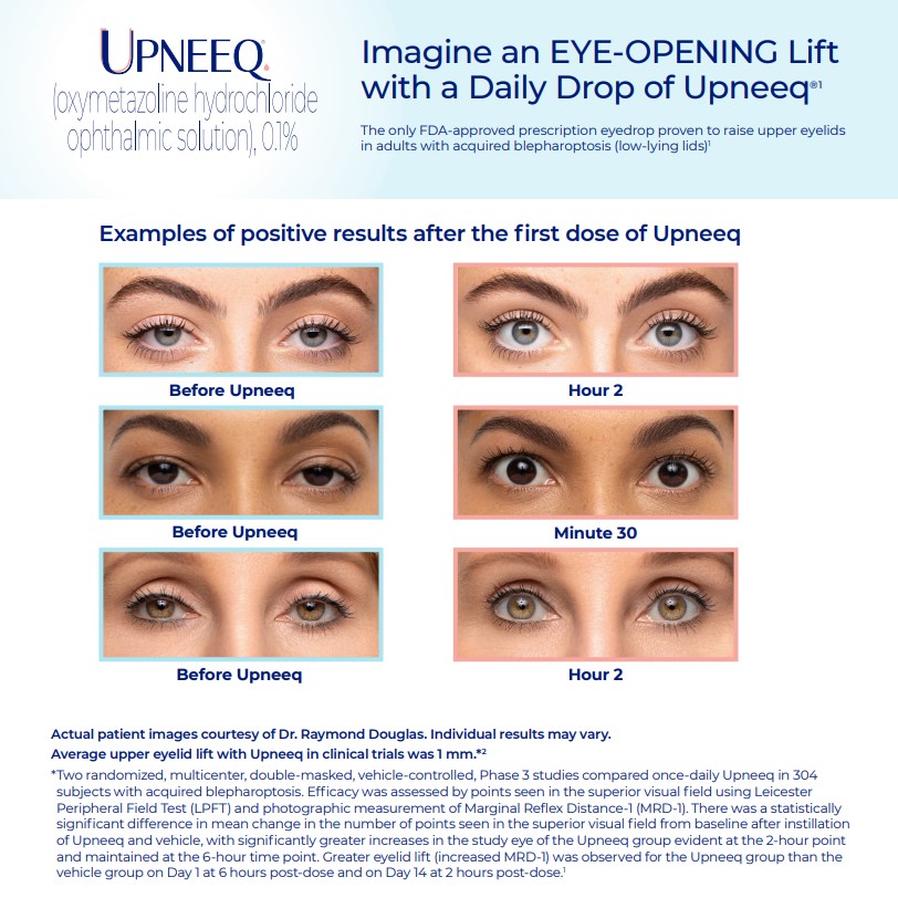 Upneeq is the only FDA-approved prescription eyedrop for acquired ptosis (low-lying lids) that lifts your upper eyelids to open your eyes